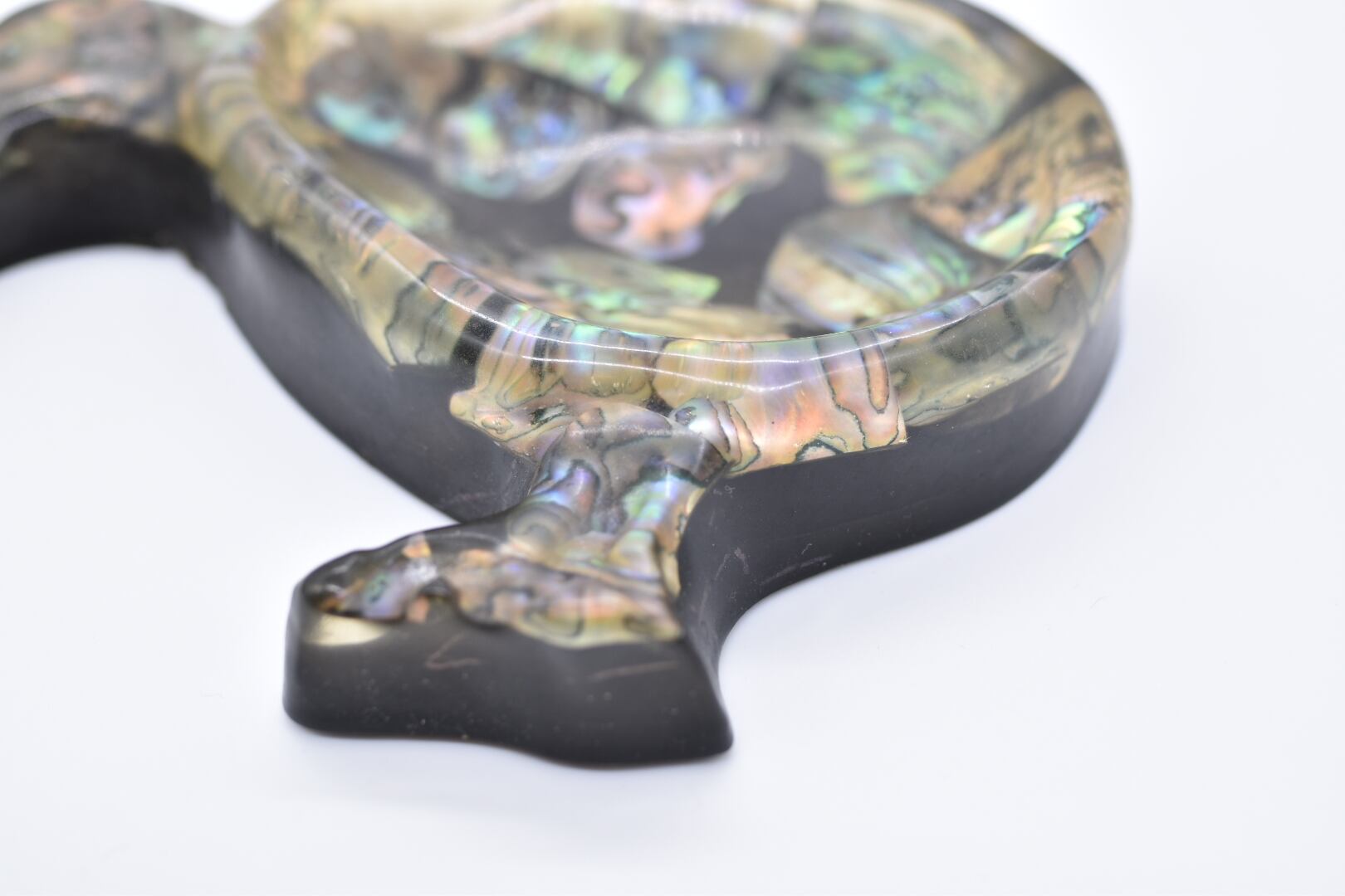 パウア貝(ニュージーランドの先住民であるマオリの言葉で特定の3種のアワビを指す)を閉じ込めた樹脂でキウイを形どったプレート。